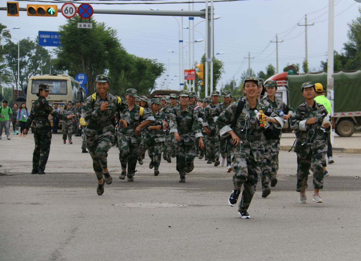 上午7点半,参训的同学背着早已准备好的行囊在训练场准时集合,经历了几天军训历练的他们,即将面对新的挑战。彩旗飘扬的田径场上,同学们身着迷彩服,那逐渐脱去了稚气的脸庞,表现出风雨无阻的昂扬斗志。拉练于8点正式开始,一条绵延数公里的“绿色长龙”浩浩荡荡向前开进。