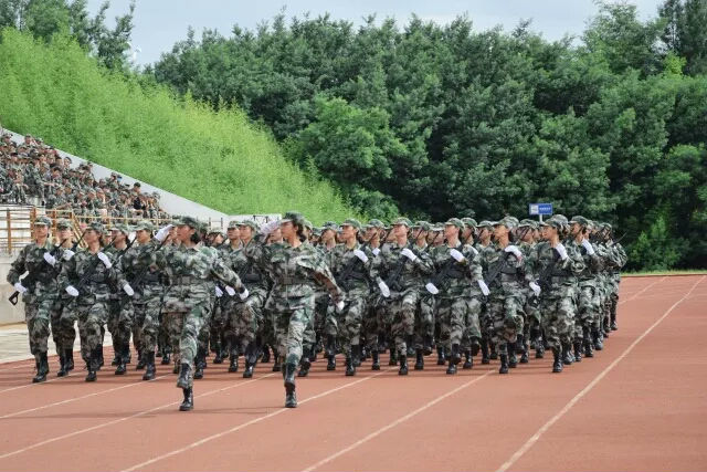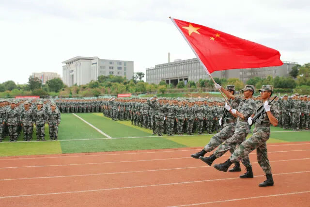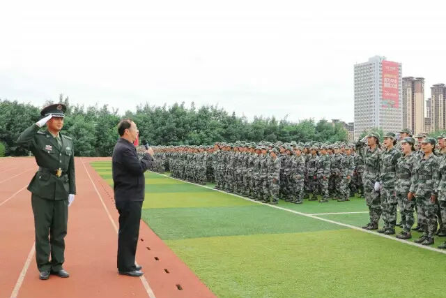 典礼在庄严的国歌声中拉开帷幕。左立竞校长检阅军训方阵。分列式方队迈着整齐的步伐,喊着嘹亮的口号依次通过主席台。整个检阅场上气势高昂,场面宏伟壮观,展现了新一代大学生的精神气魄。