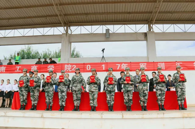 云南省全民国防教育协会学生军训基地书记杨锡光大校发言,表示希望2017级的云工商学子能把继承和发扬军人的优良作风,以全新的面貌迎接接下来的学习和生活。邹利斌常务副校长宣读优秀学员和优秀集体表彰决定,主席台就坐的各位领导向获得表彰的优秀个人代表和优秀集体代表颁发了荣誉证书。文华伟执行校长为本次军训做总结讲话,他代表学校全体师生员工,向为同学们军训付出辛劳的教官和老师们表示感谢,向获得军训表彰的优秀集体和学员表示祝贺。他希望全体学员在今后的学习和生活中发扬军人的优良传统和作风,顽强拼搏,奋勇争先,为自己的未来创造美好的明天。