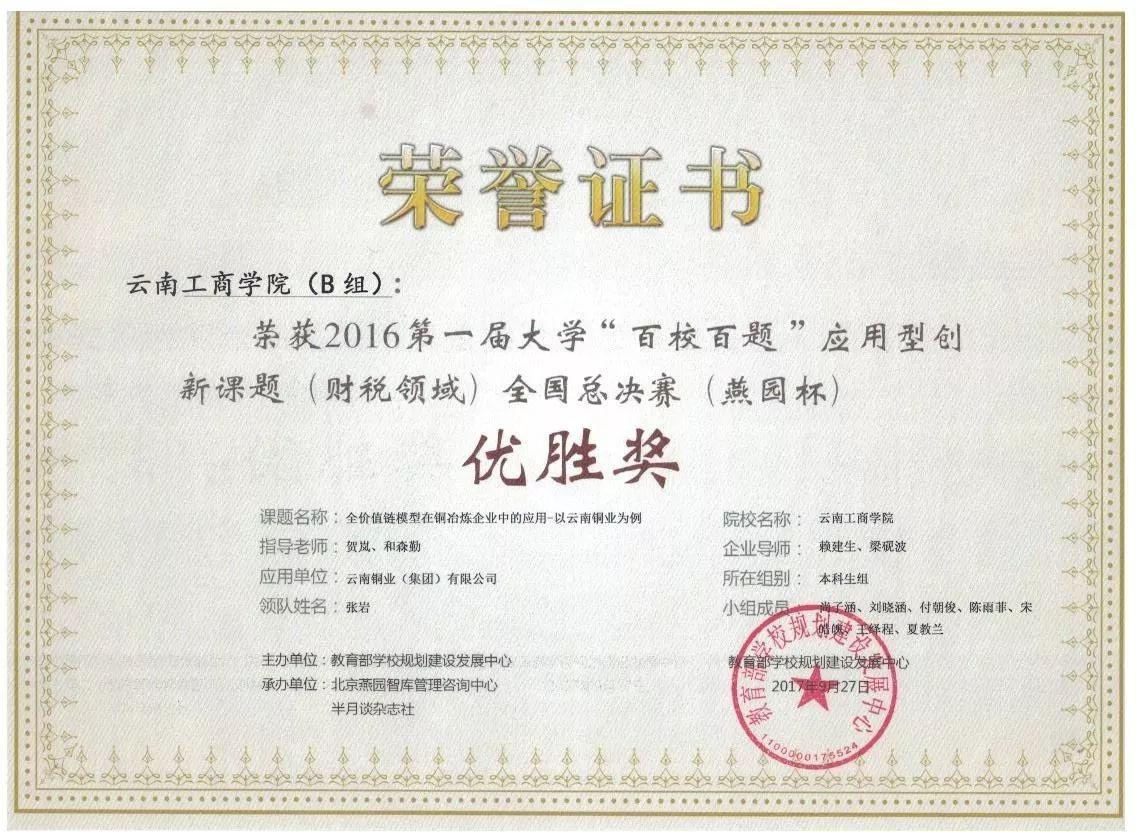 2016年11月,第一届大学(百校百题)应用型创新课题(财税领域)大赛启动后,会计学院安排和森勤、贺岚为指导老师,组建了以尚子涵、刘晓涵、付朝俊等7名同学为成员的学生团队。在课题研讨过程中,参赛团队多次深入企业调研,完成了题为《全价值链模型在铜冶炼企业中的应用—以云南铜业为例》的课题报告。在大区赛比赛中,团队凭借流畅的展示和稳定的答辩,获得全国总决赛资格,成为云南省唯一入围全国总决赛的本科院校代表队。
