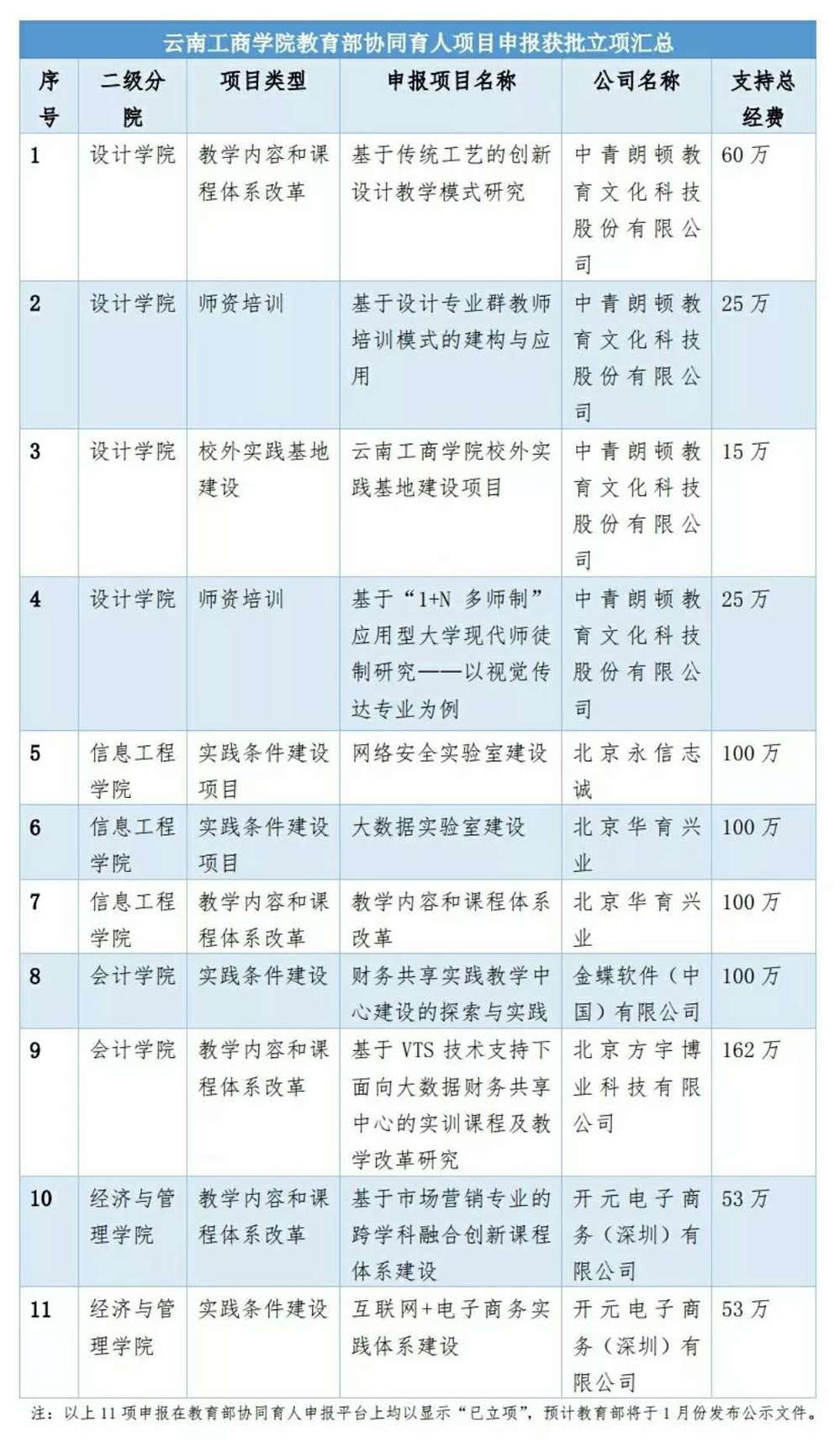 2017年12月31日,由高卫国副校长、李翔副校长和教务处牵头组织各二级分院申报的11项重大项目获得教育部产学合作协同育人平台批准立项,据悉,此次全国共有192家企业支持项目,我校的11个项目从中脱颖而出通过审批,此举凝聚着校内多学科专家学者的集体智慧,也集中体现了我校师资力量和及综合教学实力。
