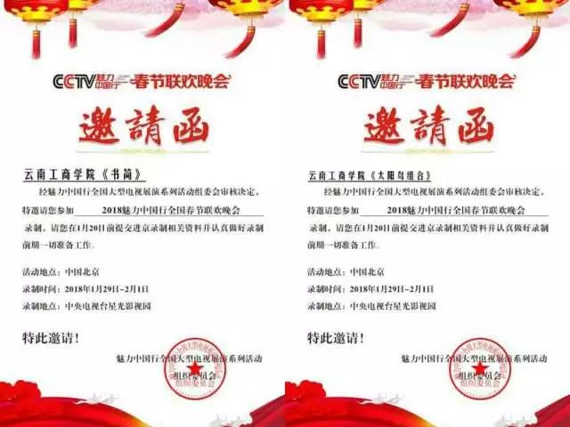 校领导高度重视,学生处、团委精心准备,1月16日云工商4个作品:舞蹈《书简》、《太阳鸟组合》,独唱:《黄孟》《袁伟》获得组委会邀请函,将于1月29日至2月1日在中央电视台星光影视园参加《2018年魅力中国行全国春节联欢晚会》的录制2018年春晚。