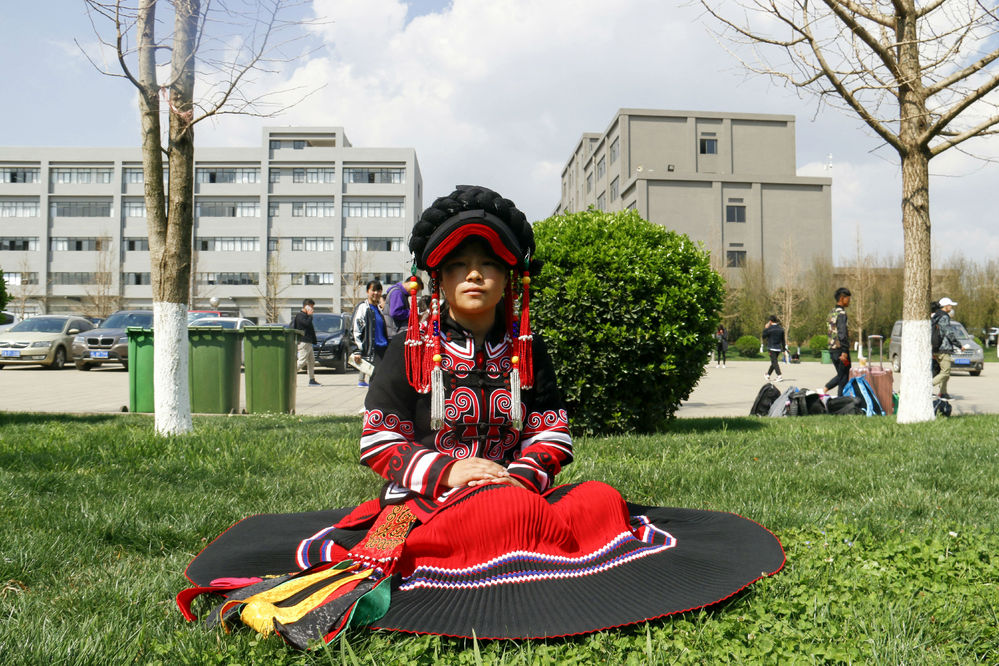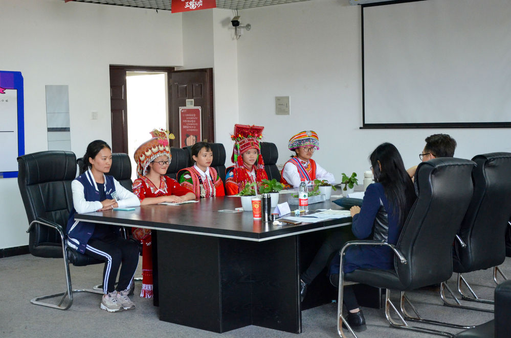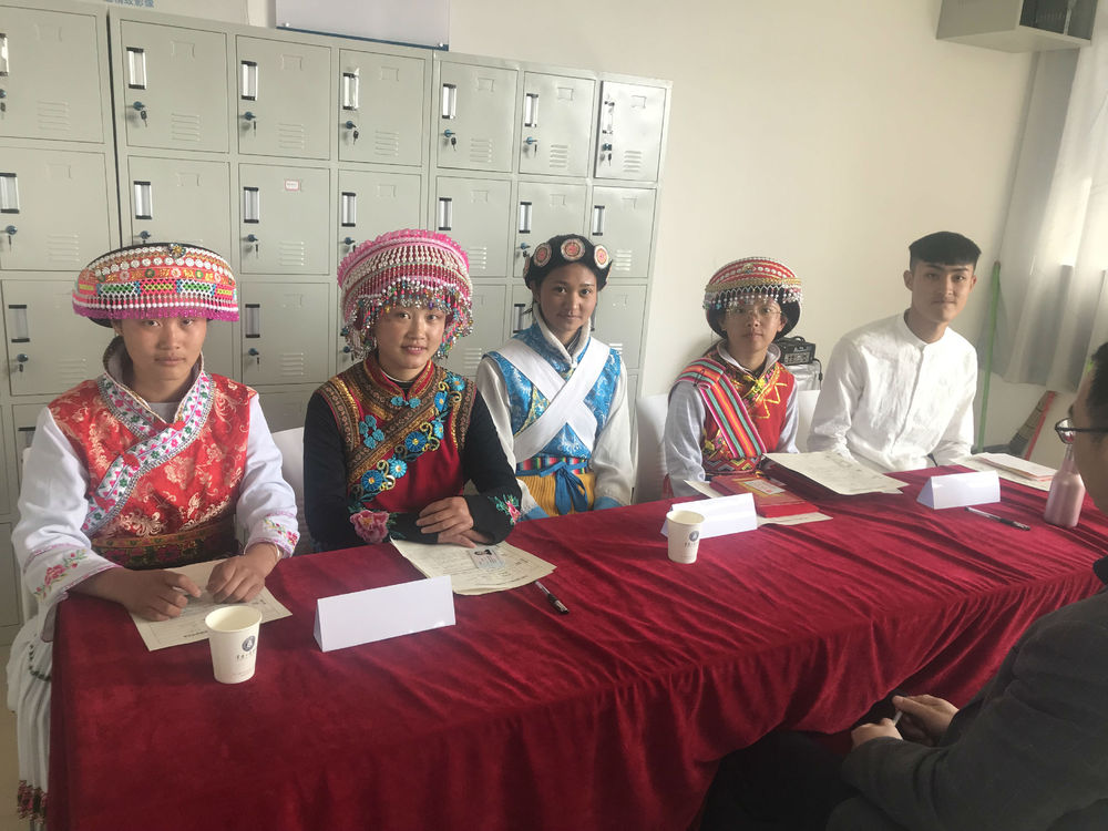 彝族同学黎娟同学身着青色的绣花上衣,头戴镶嵌珠宝的鸡冠帽,脚着一双绣花鞋。她说,我为了自己的面试准备了一支阿哲哩妹(彝语)的舞蹈,为此还练习了几天。希望能在面试过程当中给老师留下一个深刻的印象。