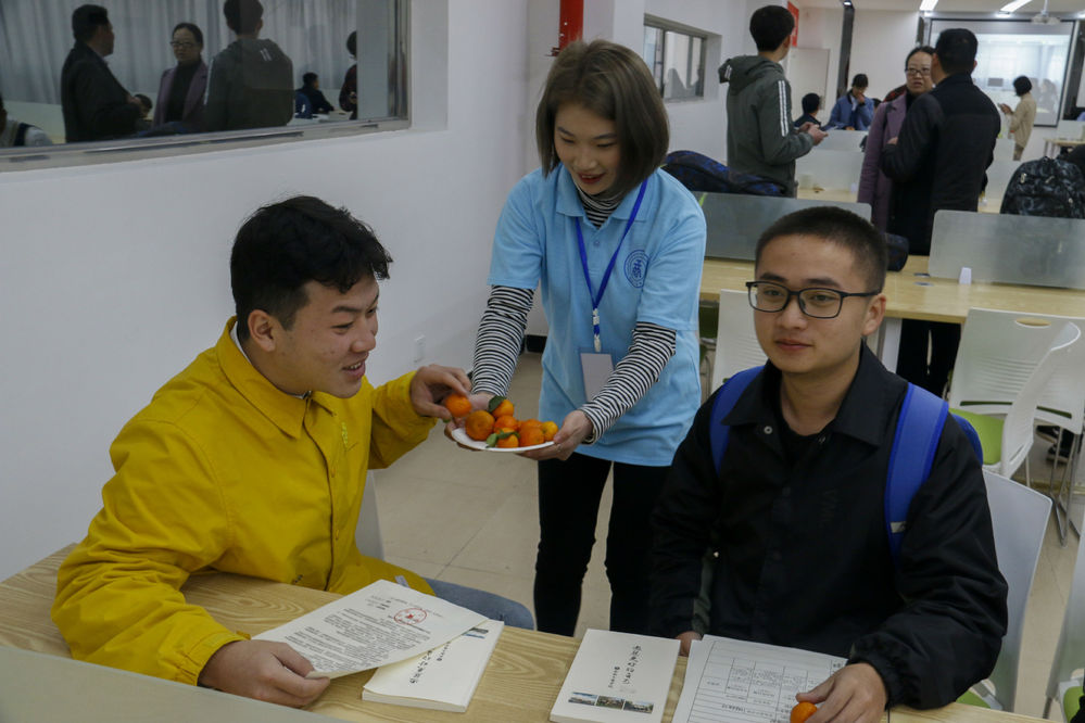 由于候场区和体育馆等候的考生较多,为了让考生提升候考体验,降低紧张情绪,会计学院安排无课教师和优秀辅导员,对候考区的考生进行面试技巧讲解,学校简介等,缓解学生紧张。同时,会计学院还临时增加一个面试组,提升考生体验感。