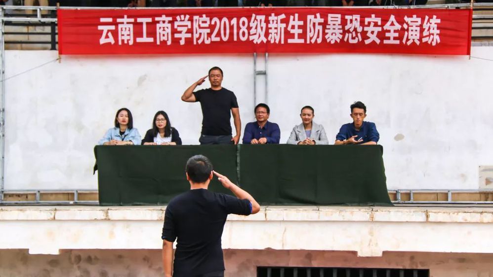 接下来的防暴恐演练由学校退伍老兵全程参演,由真实的案例改编而来,学校保卫处、各二级学院学生科、校医院等多部门联合参与演练。