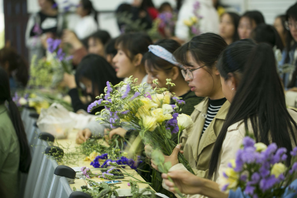 同学们认真积极地去挑选每一朵自己喜欢的花,然后慢慢跟着许蓉老师的脚步慢慢去装饰着自己手中的花朵,在插花的过程中增进了同学与老师之间的交流,也使同学们在女生节这一天增添了一丝温暖。