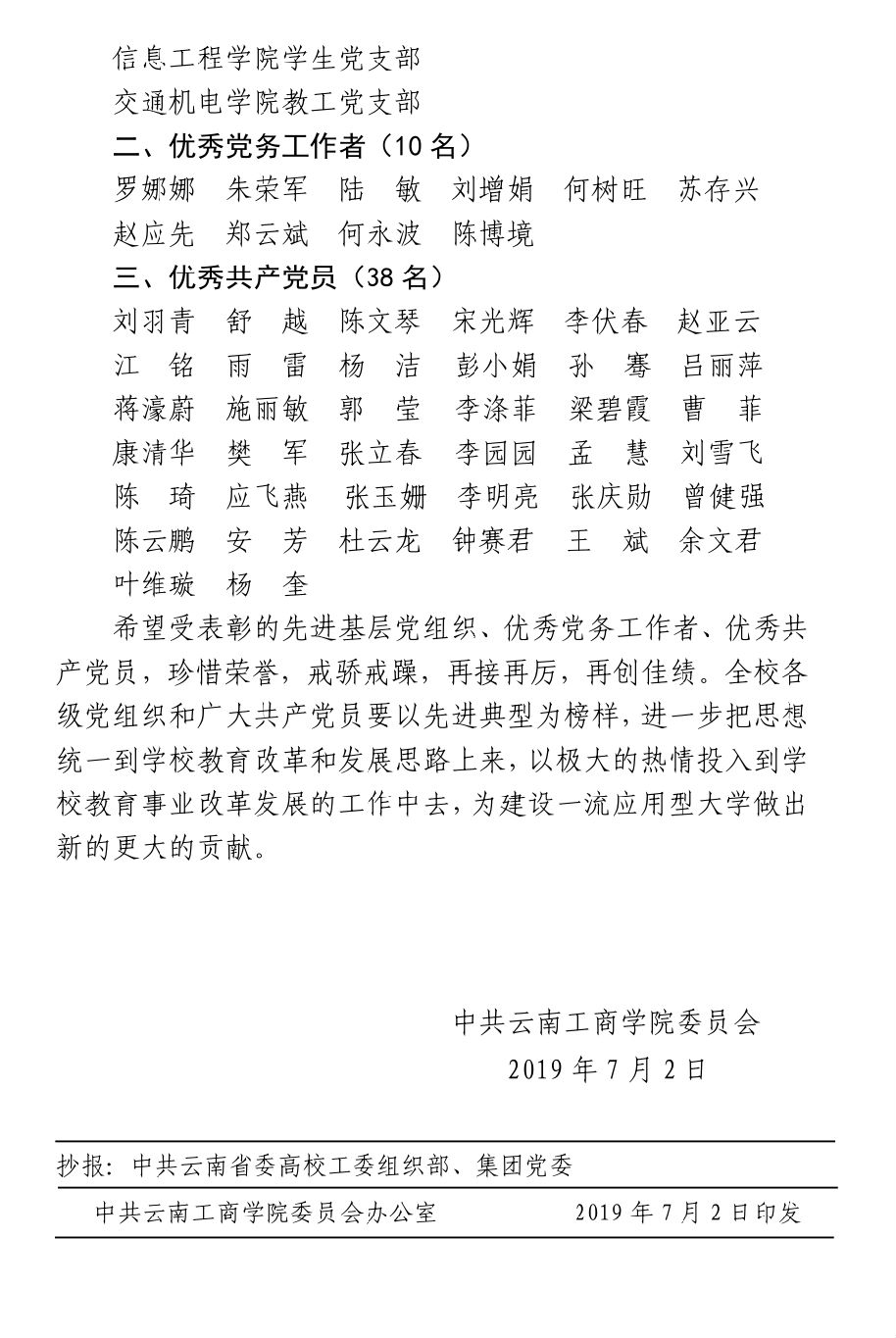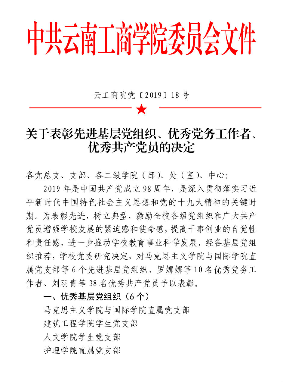 附关于表彰先进基层党组织、优秀党务工作者、优秀共产党员的决定。
