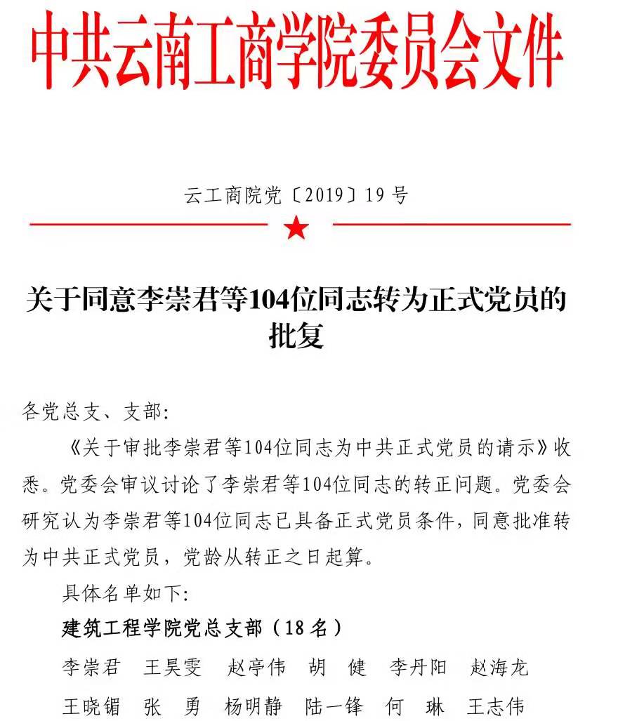 中共taptap点点官方网站委员会关于同意李崇君等104位同志转为正式党员的批复