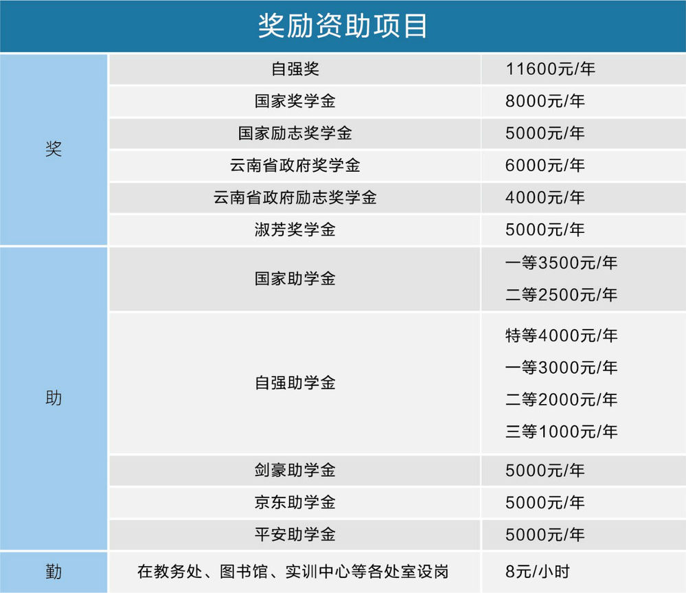 近年来,学校先后为民族发展扶持班投入400多万元,投入自强奖学金200多万元。学校还引入合作企业、优秀校友,目前在校内设立各类奖学金10余种,累计发放100余万元奖学金,资助500余名贫困学子顺利完成学业。2017年,学校与民进中央开明慈善基金会设立“一个都不能少”扶贫助学项目,项目金额达252.7万元。2019年,学校开展关爱怒江、临沧人口较少民族贫困学子捐资助学活动,对符合资助条件的贫困学生实施学费、书费、住宿费全免。