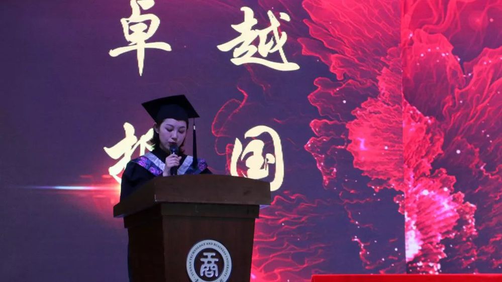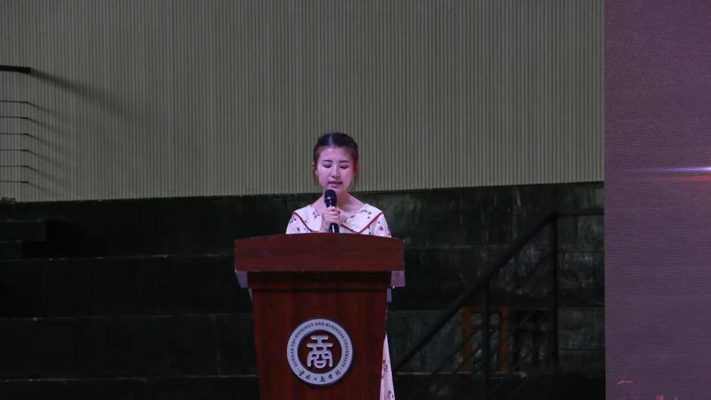 优秀毕业生钟庆辉同学作为代表发言,她表示,三年的大学生活,同学们都为了共同的目标——本科梦,而刻苦学习,这个过程培养了同学们吃苦耐劳的精神,她希望与各位同学共勉,在未来将这份精神继续发扬下去。