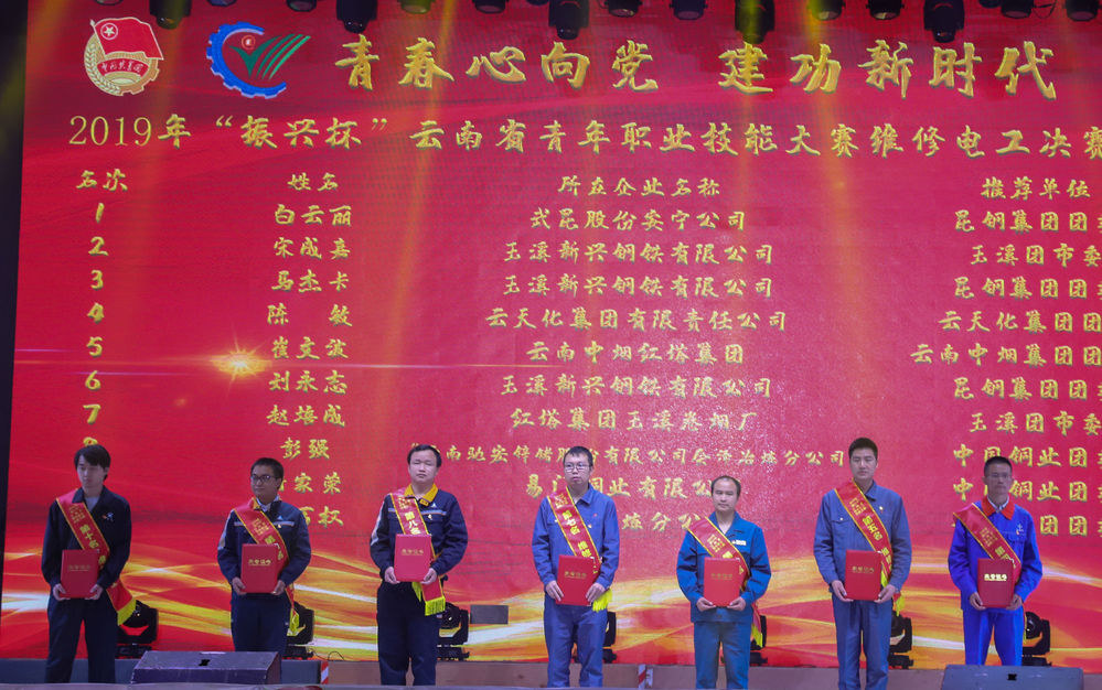 由昆明钢铁集团团委书记饶云松对“维修电工职工组”颁奖。