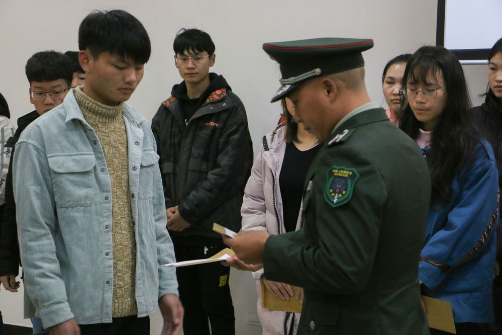 他分享了自己的成长经历:“我是从山区贫困家庭走出来的,儿时的条件十分艰苦,但正是在党和国家的好政策帮助下,我才能在今天有所作为。我作为一名军人,有义务践行社会责任,响应国家精准扶贫的号召。如今,我有能力,也希望能尽微薄之力帮助在2018级军训期间认识的家庭贫困且品学兼优的学生,积极为国家的脱贫攻坚助力,帮助他们实现梦想。”他对同学们寄予期望,希望同学们能努力学习,以优异的成绩、良好的品格,提升自己,回报国家。并表示,此项助学捐赠还将在来年继续。