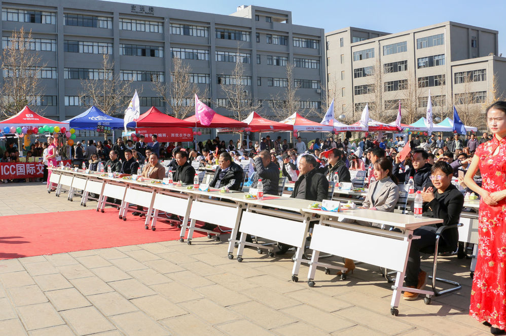 在礼仪带领下,各位领导和嘉宾自新报告厅出发穿越园林漫步校园,抵达致远广场的主会场。12个糅合不同国家特色的以“青春无国界,丝路共辉煌”为主题的留学生特色展台和12个英语类社团、二级分院展位组成的展览区早已热闹非凡,领导及嘉宾们纷纷进入展区与留学生们进行了面对面交流,并亲自体验了留学生们的手作特色食物及展览品。