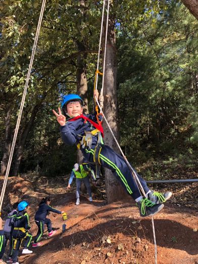 在教练员的帮助和指导下,学生们穿上攀树的设备。活动还未开始,学生们便暗自讨论着谁先来。“我来了!大树。”第一个开始攀树的学生高兴地大叫。随后,学生三个一群两个一伙开始了攀树旅程。