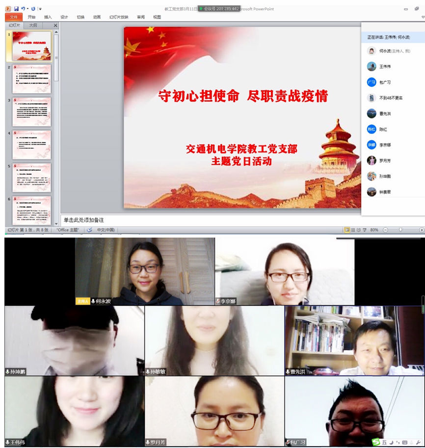 智能科学与工程学院教工党支部以“守初心担使命,尽职责战疫情”为主题开展党日活动。支部书记何永波同志围绕“守初心担使命,尽职责战疫情”这一主题,要求党员们认真学习习近平总书记关于疫情防控的重要讲话精神,学习疫情防控中的先进事迹等,并传达了学校党委3月11日党建工作部署会会议内容。