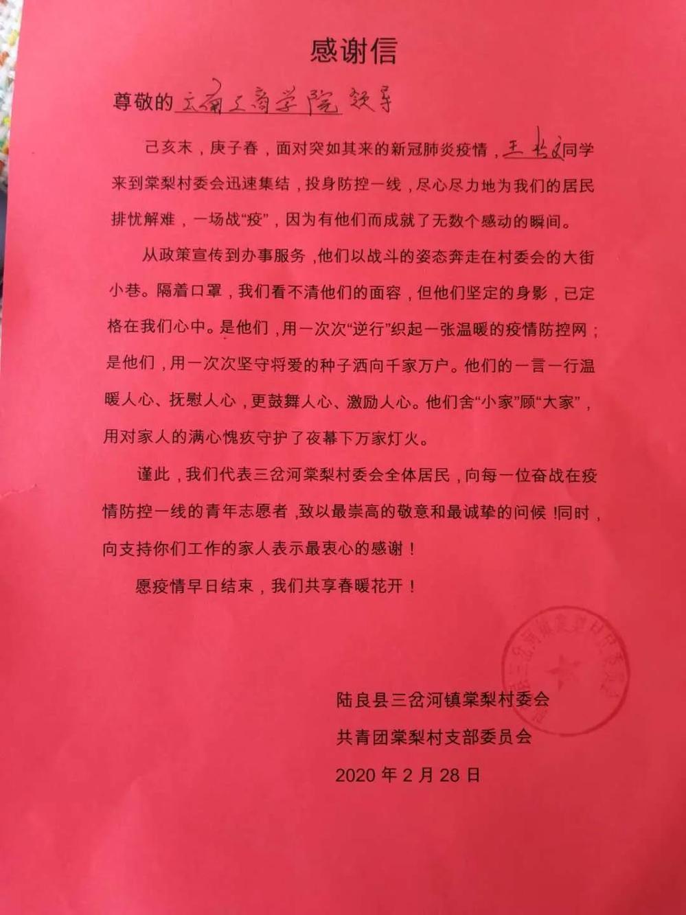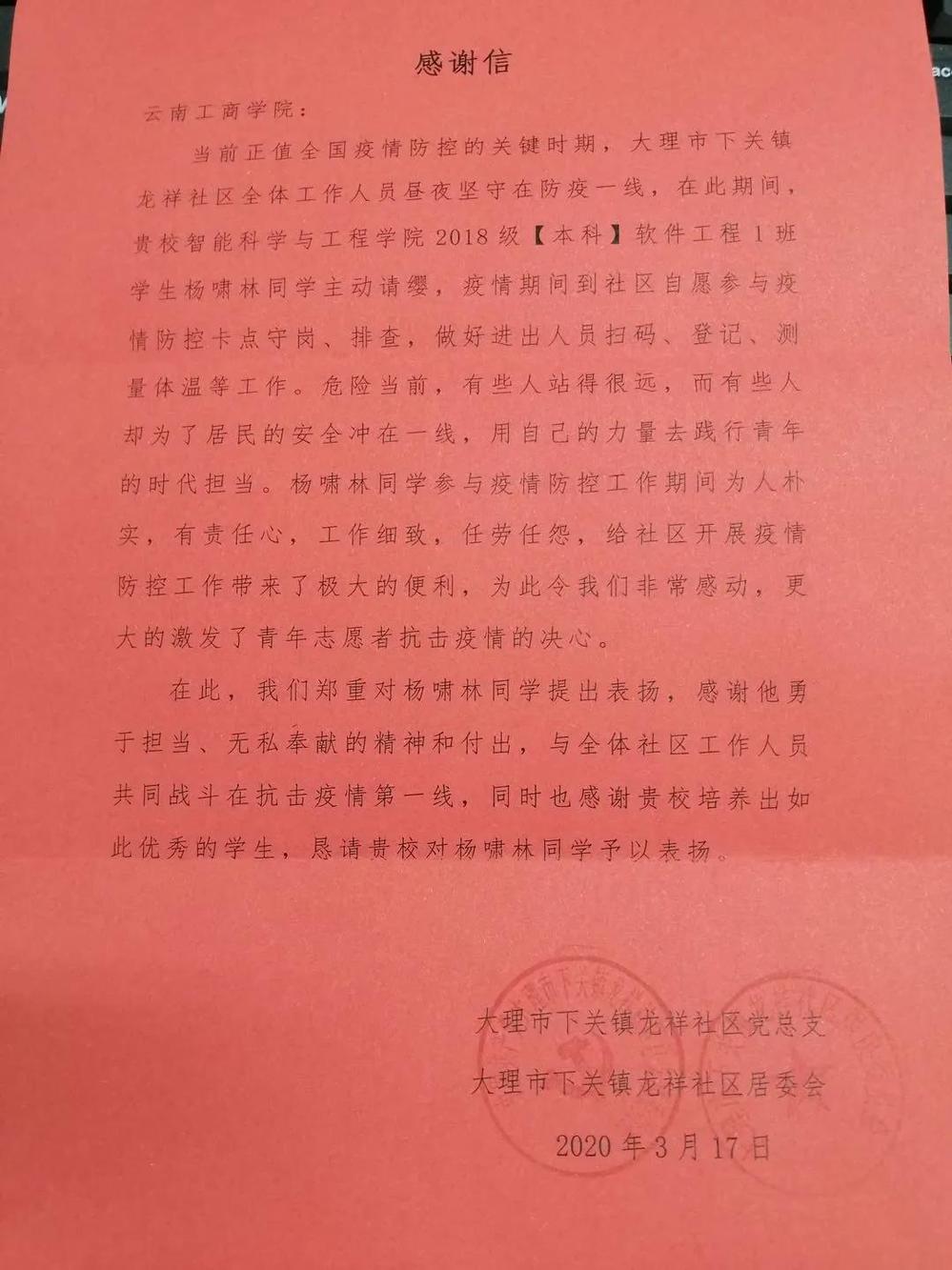 近日,学校收到了来自祖国各地的一封封感谢信,信中对在疫情期间积极参与疫情防控工作的taptap点点官方网站学子表达了感谢,并给与了高度评价。