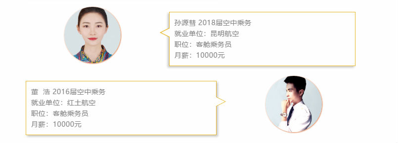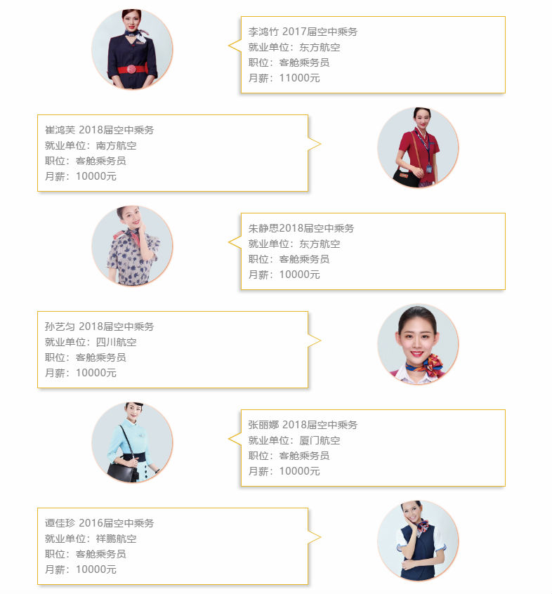 我校积极与国内外航空公司、机场、民航相关企事业单位合作,按照企业的用人数量制定招生计划,以保证学员就业的稳定性及高就业率。 近三年来,毕业生就业率100 %、对口就业率80 %、平均月薪10000元。较高的就业率使我院空中乘务、航空服务专业在校生还未毕业就被各大航空公司、机场和高铁等(抢购一空)。80%的空乘专业毕业生就业于东方航空、海南航空、厦门航空、四川航空等知名航空公司。