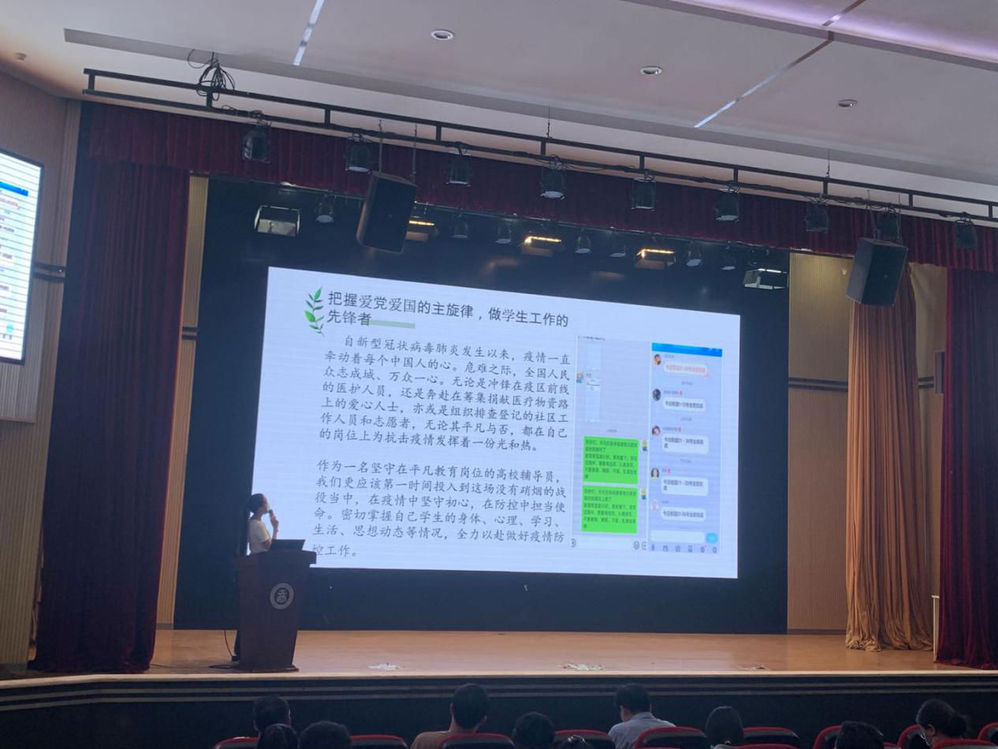 随后,人文教育学院辅导员罗娜娜老师做了题为《同心战(疫),同(屏)共振》的防疫工作经验分享。她通过自己所扮演角色——学生工作的先锋者、引领者、传递者和奉献者,讲述了作为一名坚守在平凡教育岗位的辅导员,更应该第一时间投入到这场没有硝烟的战役当中,在疫情中坚守初心,在防控中担当使命。密切掌握学生的身体、心理、学习、生活、思想动态等情况,全力以赴做好疫情防控工作。