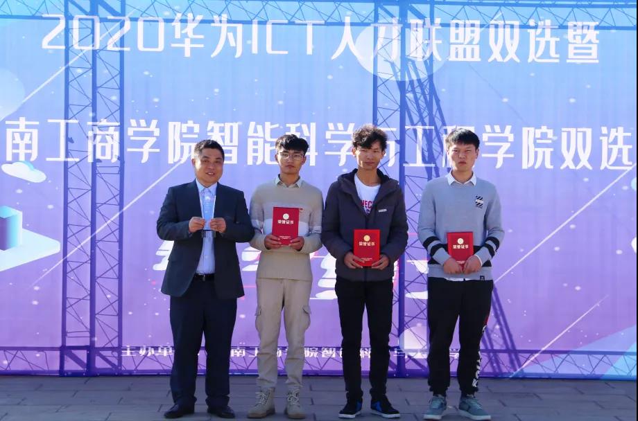 同时,在刚刚结束的华为ICT大赛中,我校丁石林、马章成、米如斌三位同学组成的代表队经过不懈努力,获得了实践赛网络赛道云南省一等奖的好成绩。由尹正才经理为他们颁发了华为ICT比赛证书。