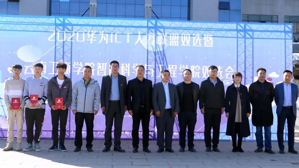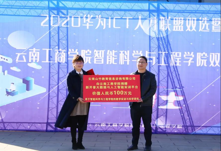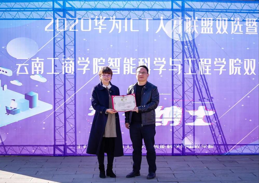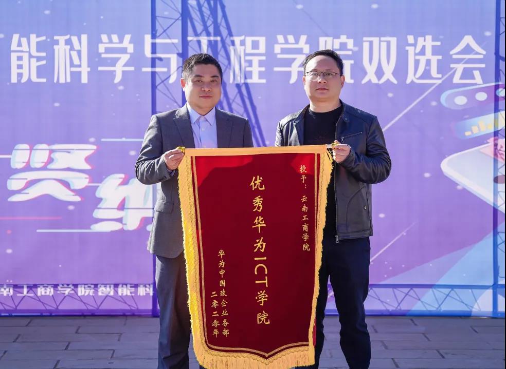 活动开幕式上,华为技术有限公司昆明办事处华为人才生态经理尹正才为学校颁发了(优秀华为ICT学院)锦旗,以此表彰我校对华为ICT生态人才培养的贡献。