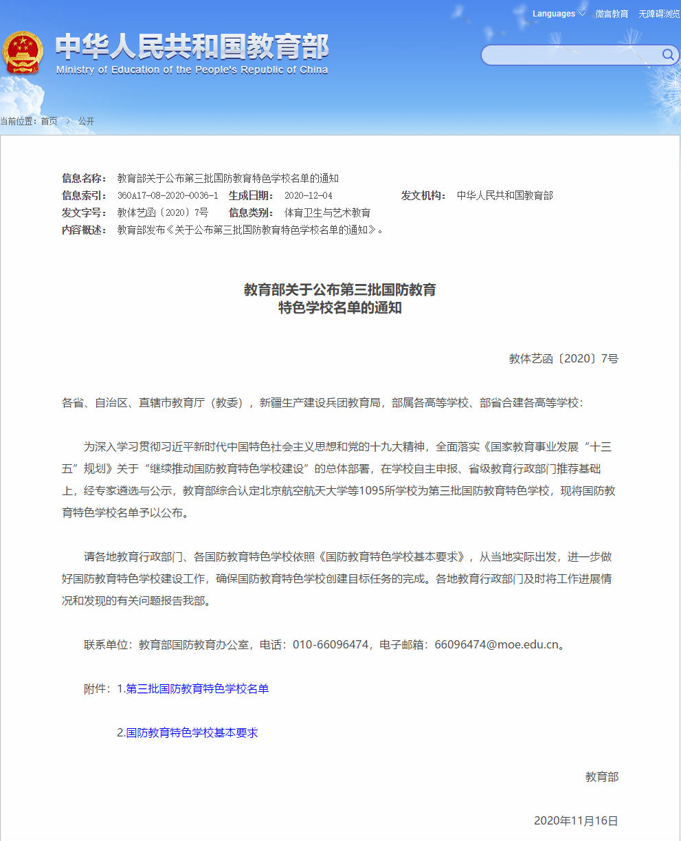 近日,教育部官方网站发布《教育部关于公布第三批国防教育特色学校名单的通知》,公布了第三批国防教育特色学校名单。