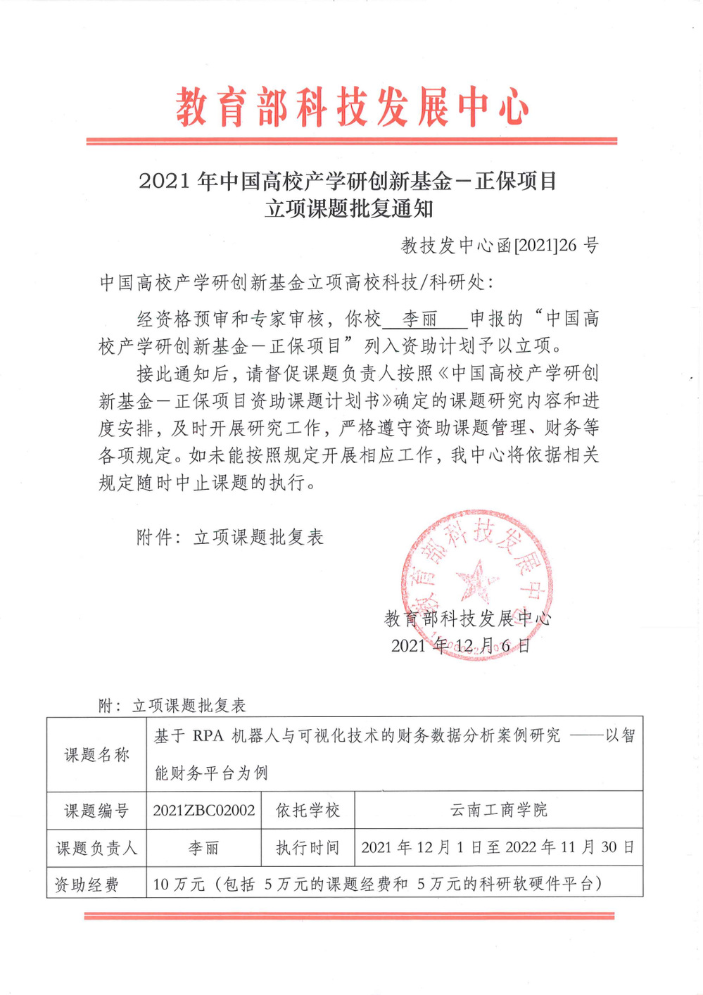 近日,教育部公布了2021年中国高校产学研创新基金项目名单,taptap点点官方网站会计学院李丽老师申报的“基于RPA机器人与可视化技术的财务数据分析案例研究——以智能财务平台为例 ”课题入选,将予以立项,并列入资助计划,资助经费为10万元。