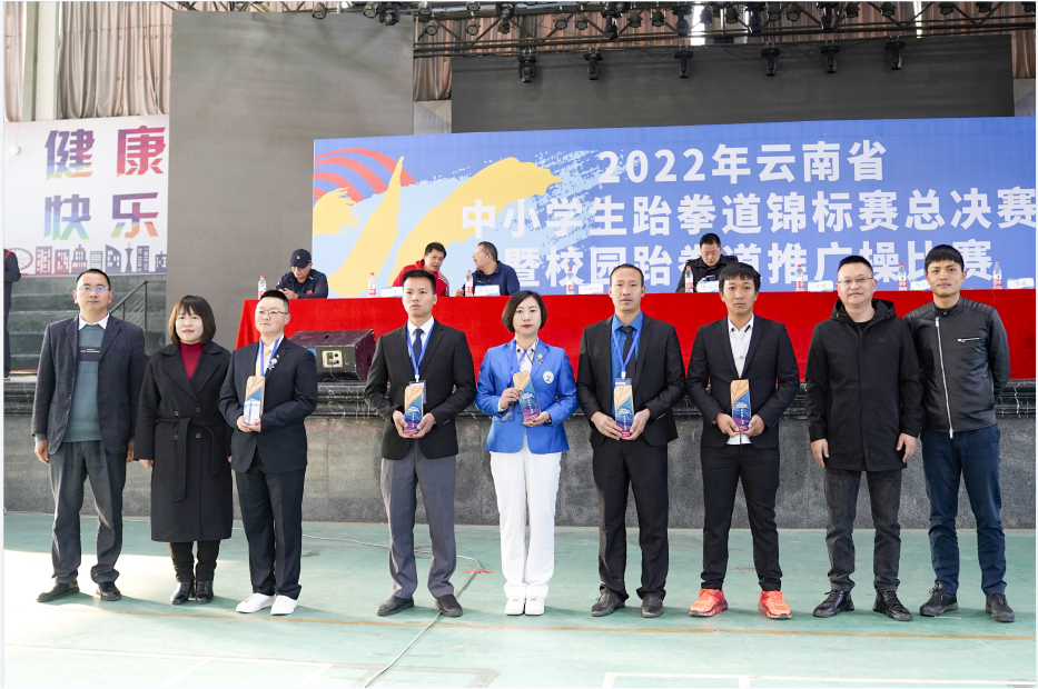 开幕式中,各级领导向2022年为云南校园跆拳道做出贡献的单位颁发了奖杯。