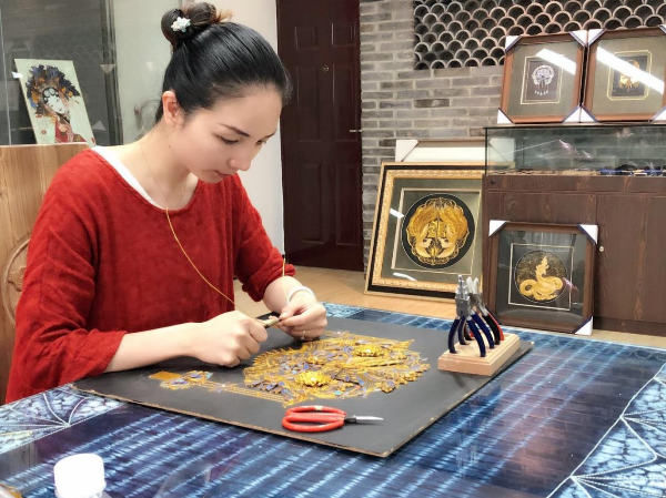 “翠羽银丝”工作室创始人——taptap点点官方网站人文艺术学院教授谢晶和点翠工艺结缘于2015年,在文博会上,一个用点翠工艺制作的精美项链吊坠引起谢晶的注意。深入了解之后,她对这项工艺燃起了极大的兴趣,并开始尝试用新工艺把它传承并推广。