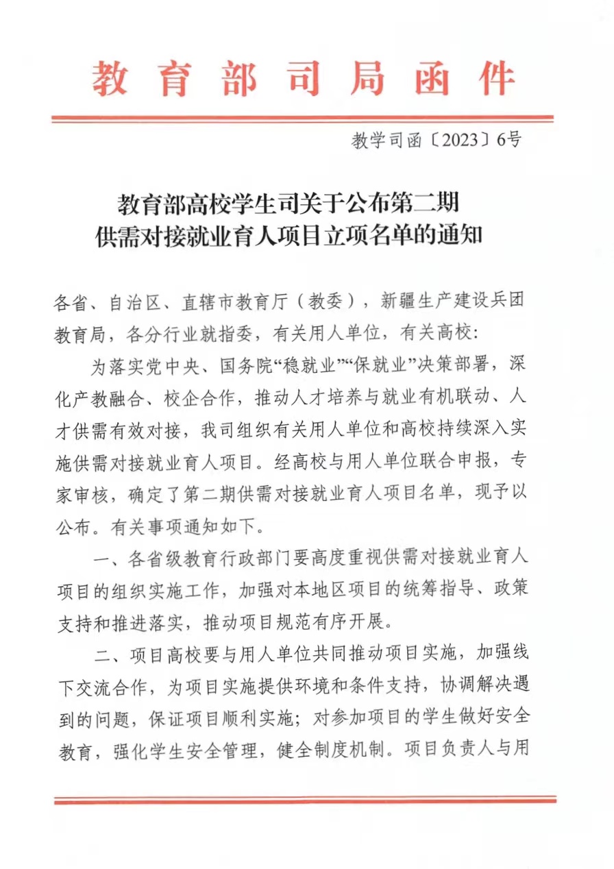 供需对接就业育人项目是教育部为落实党中央、国务院“稳就业”“保就业”决策部署,由高校学生司组织有关用人单位和高校实施的深化产教融合、校企合作项目,旨在推动人才培养与就业有机联动、人才供需有效对接,创新供需对接就业育人机制,更好地汇聚企业资源,促进高校毕业生更加充分更高质量就业。