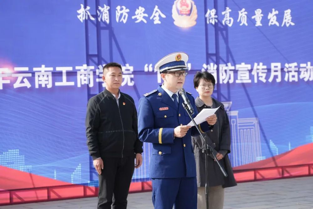 嵩明县消防救援大队侯尊尧工程师发表了讲话,他倡议学校在普及消防安全知识的同时,紧抓消防安全落实工作,加强消防安全建设,排查消防隐患,为广大师生提供安全的学习生活环境。