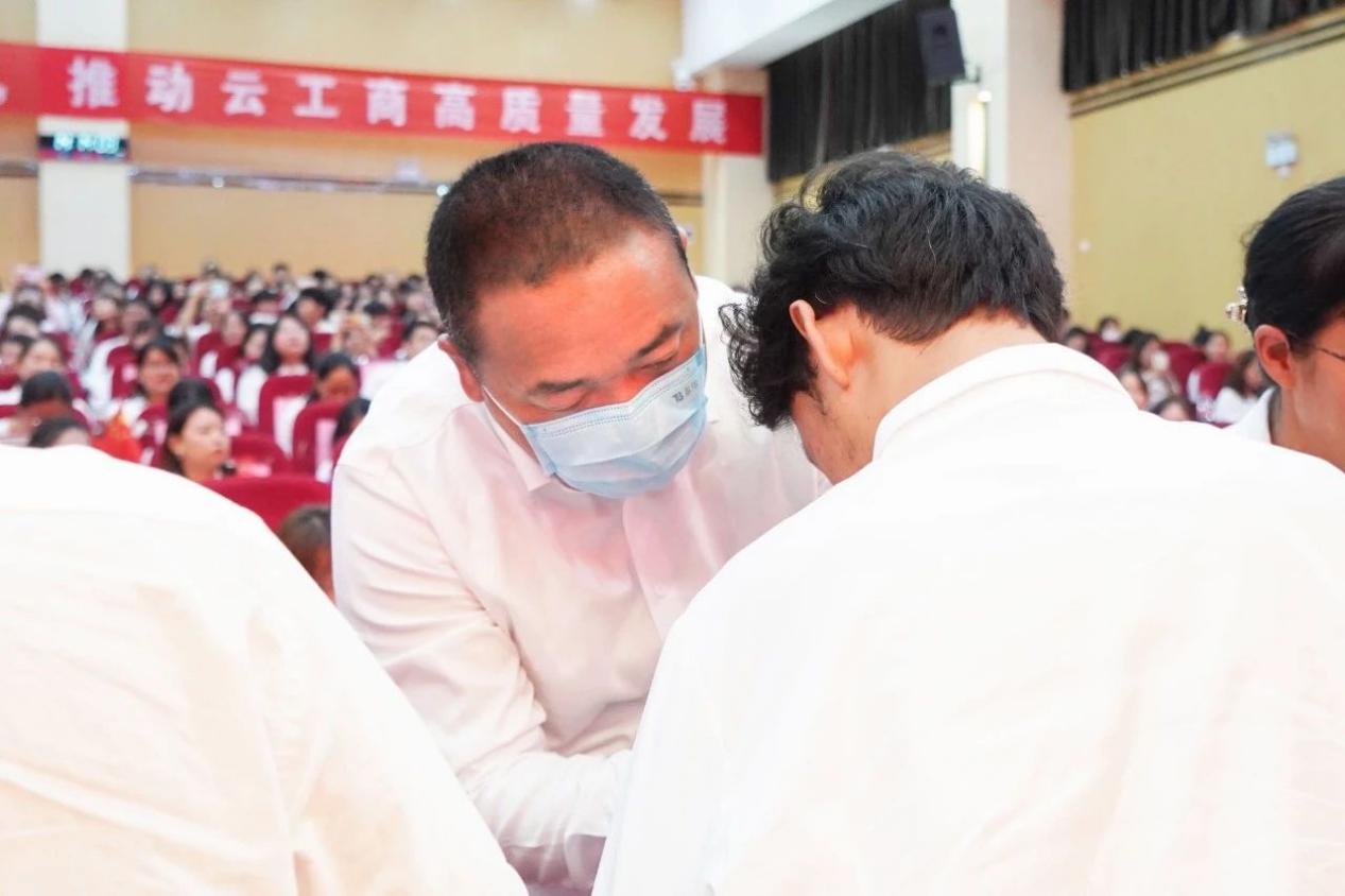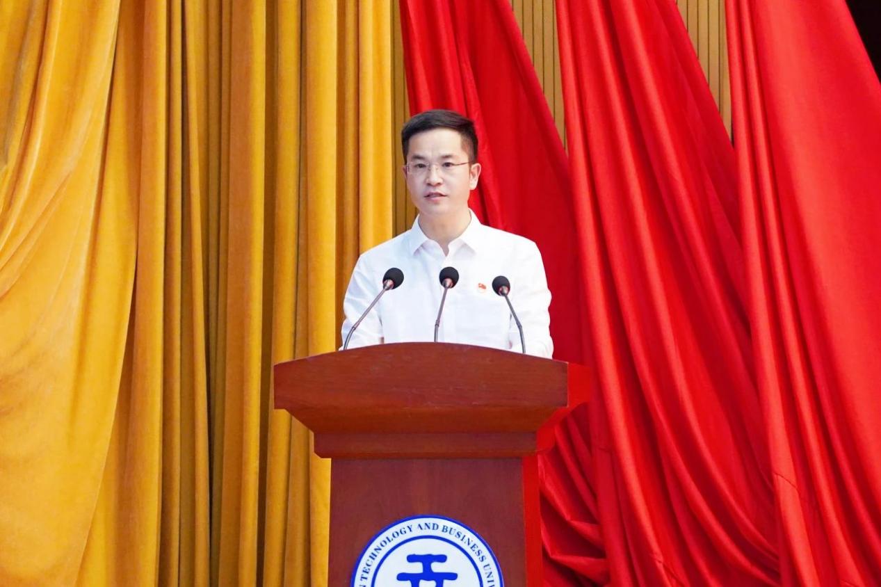 大会在雄壮的国歌声中拉开帷幕。李国琼代表学校党委向受表彰的先进集体和先进个人表示热烈祝贺,向全校共产党员致以崇高敬意和节日问候,向新加入党组织的预备党员表示诚挚欢迎。李国琼指出,近年来,我们持续推动党的建设与学校事业发展深度融合,以高质量党建引领推动学校高质量发展,特色鲜明、国内知名的应用型大学建设迈出新步伐,学校办学水平不断提高,综合实力不断增强,各项事业呈现出蓬勃向上的良好发展势头,演绎了“一融双高”的生动实践。广大共产党员在本科合格评估的艰难岁月中,在疫情防控的生命守护中,在服务学生发展的教学、科研、后勤保障等一线工作中,奋勇争先、率先垂范,让党旗高高飘扬,为学校建设发展作出了积极贡献。要求全体党员以“云工商建校24周年——高质量发展迈向新征程”为新的起点,一要以党员身份为荣,追逐理想之光;二要以党性修养为根,涵养信仰之魂;三要以党务工作为范,培塑实干之风,坚持党的教育方针,落实立德树人根本任务,为党育人、为国育才,在促进民族团结进步、服务区域经济社会发展和建设教育强国新征程中作出云工商新的更大贡献。