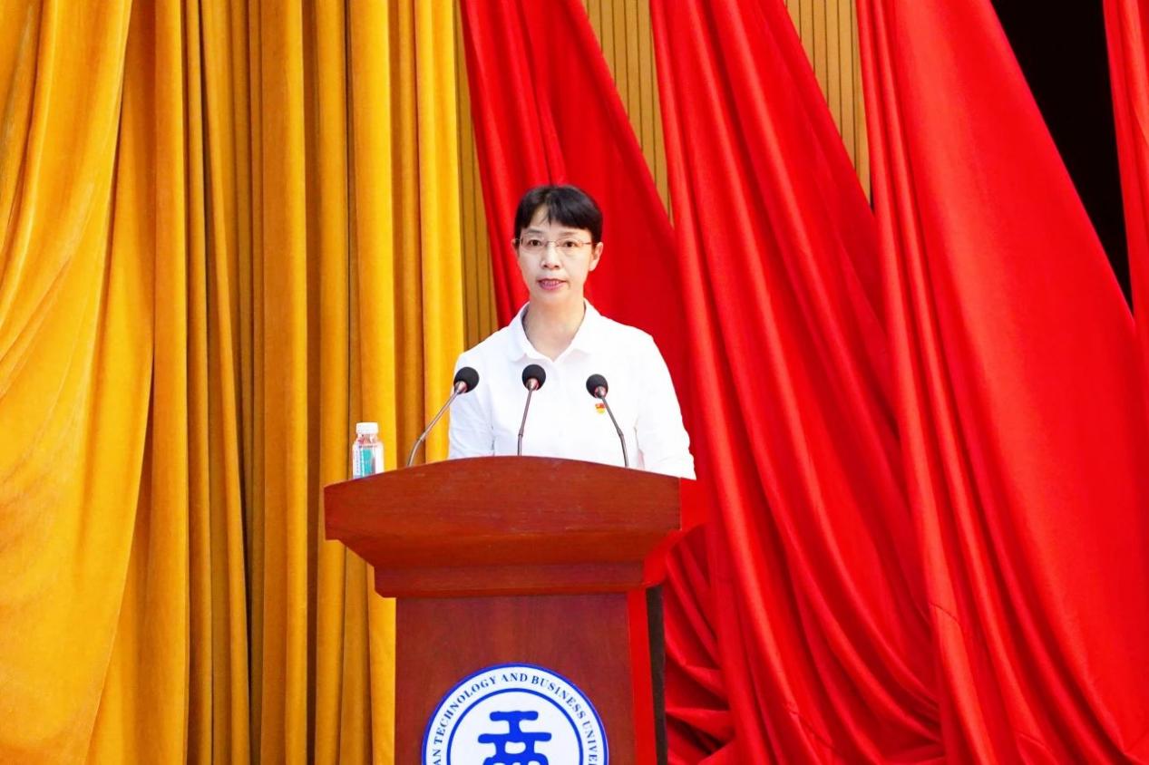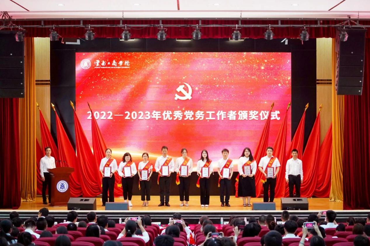 大会在雄壮的国歌声中拉开帷幕。李国琼代表学校党委向受表彰的先进集体和先进个人表示热烈祝贺,向全校共产党员致以崇高敬意和节日问候,向新加入党组织的预备党员表示诚挚欢迎。李国琼指出,近年来,我们持续推动党的建设与学校事业发展深度融合,以高质量党建引领推动学校高质量发展,特色鲜明、国内知名的应用型大学建设迈出新步伐,学校办学水平不断提高,综合实力不断增强,各项事业呈现出蓬勃向上的良好发展势头,演绎了“一融双高”的生动实践。广大共产党员在本科合格评估的艰难岁月中,在疫情防控的生命守护中,在服务学生发展的教学、科研、后勤保障等一线工作中,奋勇争先、率先垂范,让党旗高高飘扬,为学校建设发展作出了积极贡献。要求全体党员以“云工商建校24周年——高质量发展迈向新征程”为新的起点,一要以党员身份为荣,追逐理想之光;二要以党性修养为根,涵养信仰之魂;三要以党务工作为范,培塑实干之风,坚持党的教育方针,落实立德树人根本任务,为党育人、为国育才,在促进民族团结进步、服务区域经济社会发展和建设教育强国新征程中作出云工商新的更大贡献。