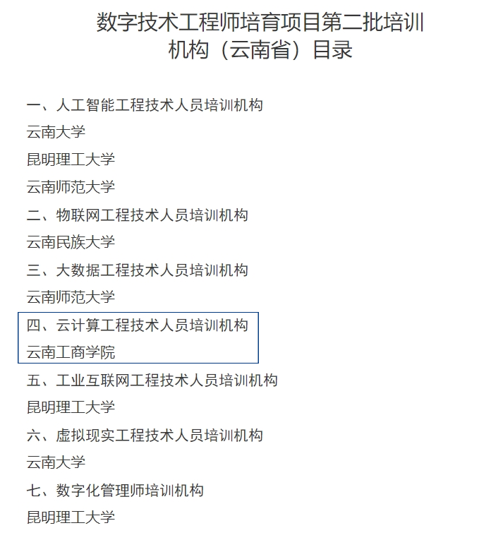 近日,云南省人力资源和社会保障厅发布了《关于公布数字技术工程师培育项目第二批培训机构目录(云南省)的公告》,我校成功获批云南省唯一数字技术工程师培育项目云计算工程技术人员培训机构,也是云南省唯一获此类荣誉的同类院校。