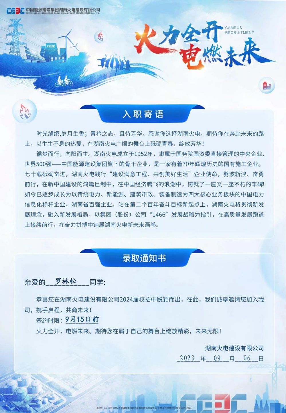 大家好,我是罗林松,高中毕业于祥云一中,大学期间获得过国家励志奖学金,并于2022年11月成为一名中共预备党员。目前已与中国能源建设集团湖南火电建设有限公司签订就业协议,等待毕业之后到公司报道入职。