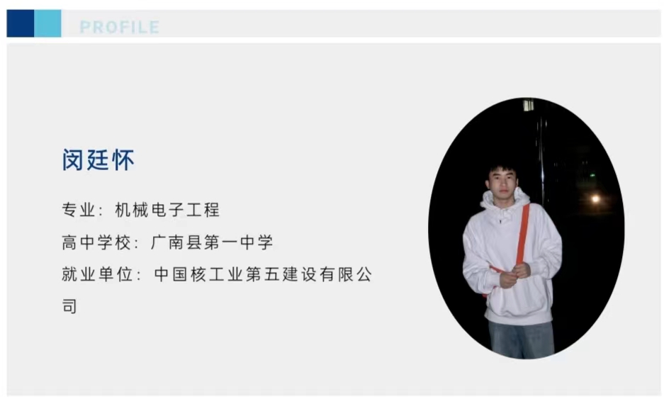 今天,让我们一起听听来自智能科学与工程学院的闵廷怀,是如何从认真对待每一件小事到成功走进中国核工业第五建设有限公司的故事吧!