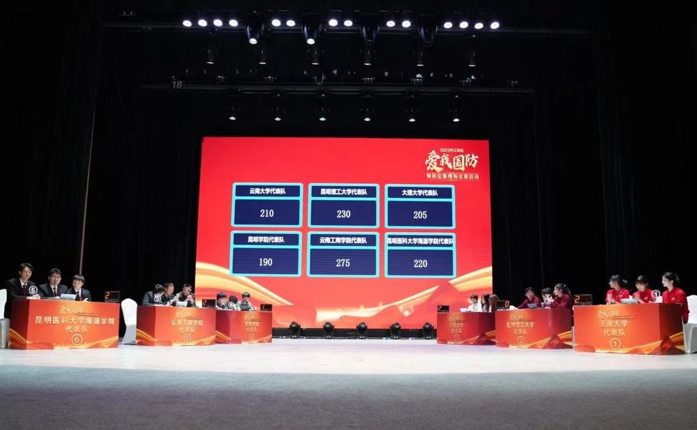 比赛共设置了勇往直前(必答题)、抢滩登陆(抢答题)、险中求胜(风险题)三个环节,现场氛围热烈,参赛选手们沉着冷静,认真审题作答,队员间配合默契。云工商代表队团结奋进、顽强拼搏,充分展现了他们扎实的国防知识储备和强大的心理素质,经过激烈的比拼,最终以高出第二名45分的好成绩胜出。