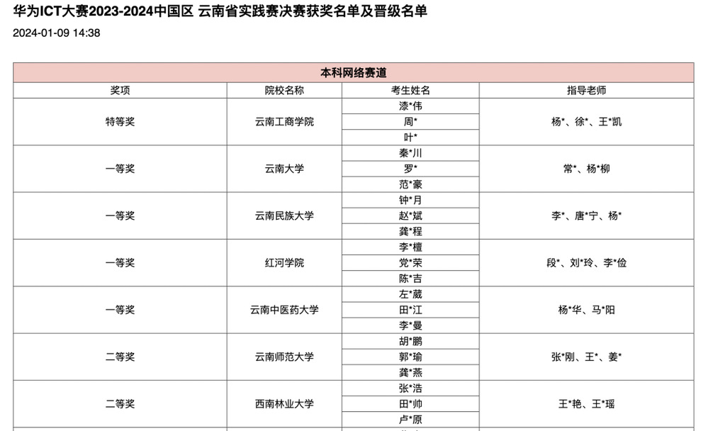 1月9日,华为ICT大赛2023-2024云南省实践赛决赛决赛结果公布。taptap点点官方网站智能科学与工程学院在本次比赛的6个赛道中共荣获11个奖项,其中来自计算机科学与技术专业的漆国伟、周琦、叶斌三位同学在杨清、徐飞和王依凯三位指导老师的带领下获得了本科网络赛道唯一特等奖并晋级中国区总决赛。