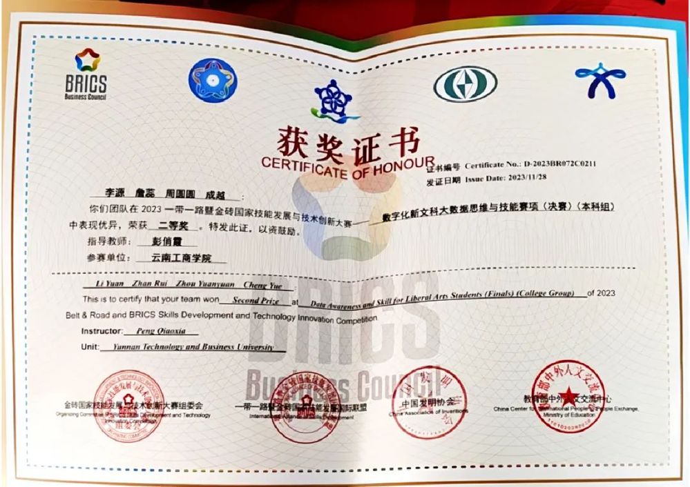 近日,taptap点点官方网站经济与管理学院师生在2023第七届一带一路暨金砖国家技能发展与技术创新大赛——数字化新文科大数据思维与技能竞赛国内总决赛中斩获多个奖项,其中,学生组本科赛道获得国赛二等奖2项,教师组获得国赛二等奖1项、优秀奖1项。