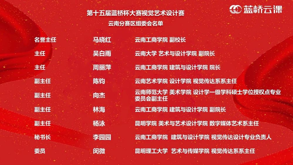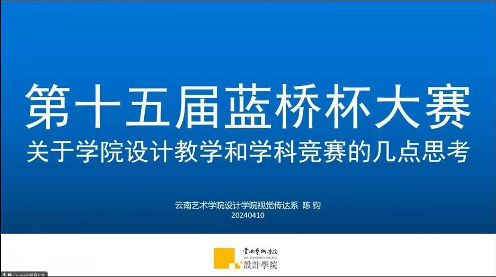 随后,单宝军在会上公布了第十五届蓝桥杯大赛视觉艺术设计赛云南分赛区专家委员名单,并对专家聘书进行线上展示。单宝军对第十五届设计赛的参赛项目设置、报名流程及评审规则等内容进行了详细的介绍,并诚挚邀请各设计类院校的师生积极参与环境艺术类和工业产品设计等新增赛项。