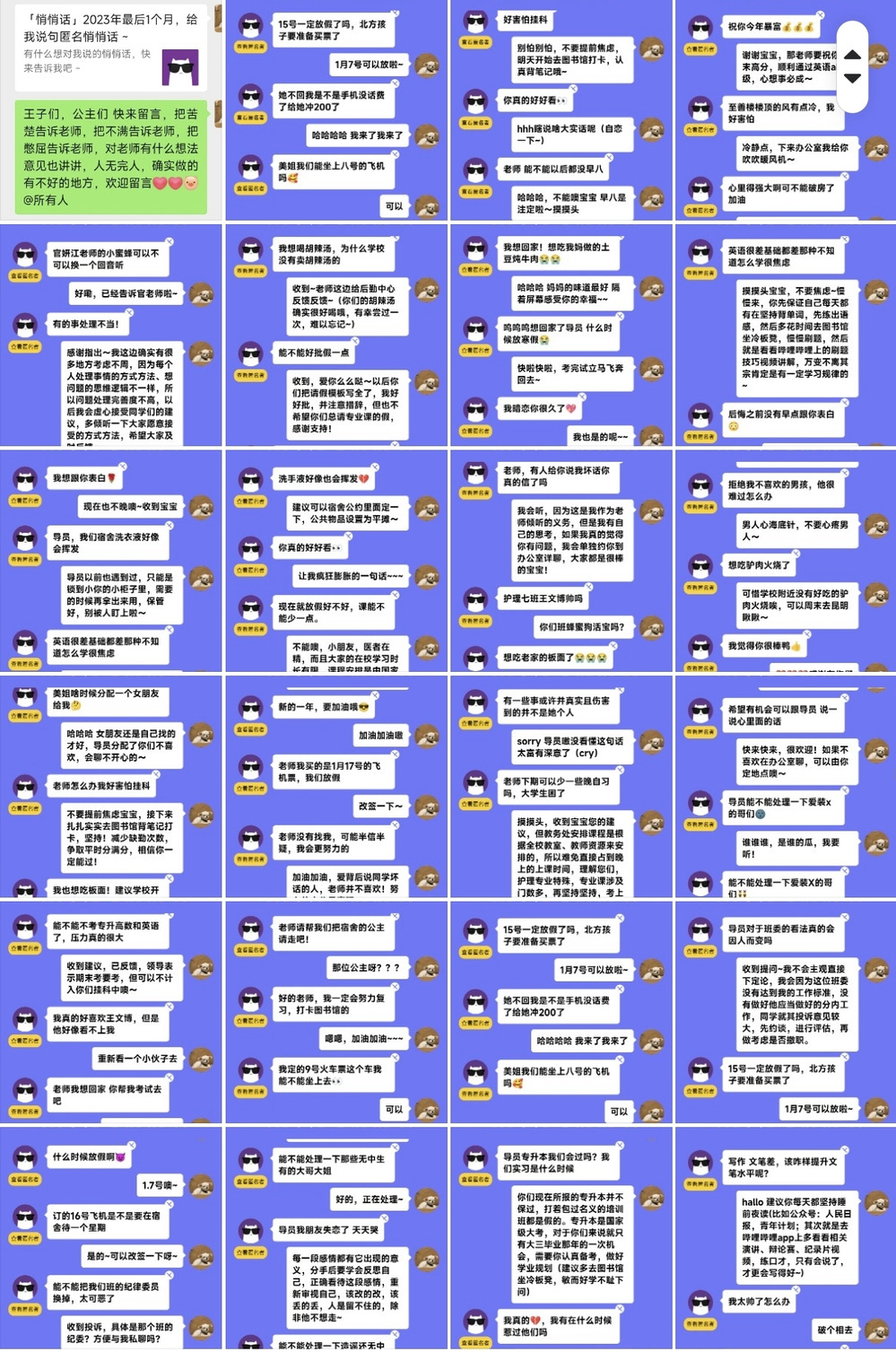 和学生打破隔阂,真正走进学生心里,除了日常的陪伴,谈心谈话也尤为重要。然而在现实中,同学们有时不理解辅导员老师为何要谈心谈话,还会不由自主的惧怕谈话,或在谈话中放不开、不敢吐露心事,担心被“泄密”等。所以,为了更好地掌握与同学们谈话的方法和技巧,小美老师换位思考尝试了许多方法,其中之一就是“悄悄话留言”,通过“悄悄话”的方式与同学们交流、倾听烦恼、接收投诉,这种方式打破了传统意义上的谈心谈话,不束缚同学们的交流想法,进而更好地打通了师生彼此间的沟通阻断。