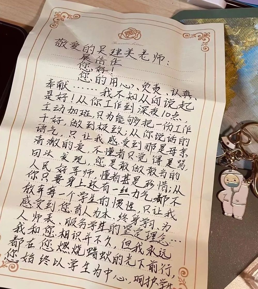 只言片语难表师言,作为文浩同学的成长见证者,小美老师欣慰、敬佩之情难掩。她说:“我非常幸运地成为新时代青年的思想引领工作中的一员,虽微小,却自豪,能够见证一批又一批,一代又一代熠熠生辉、热血昂扬的新时代青年的成长,这正是未来祖国的发展无限可能的缩影与映射。”