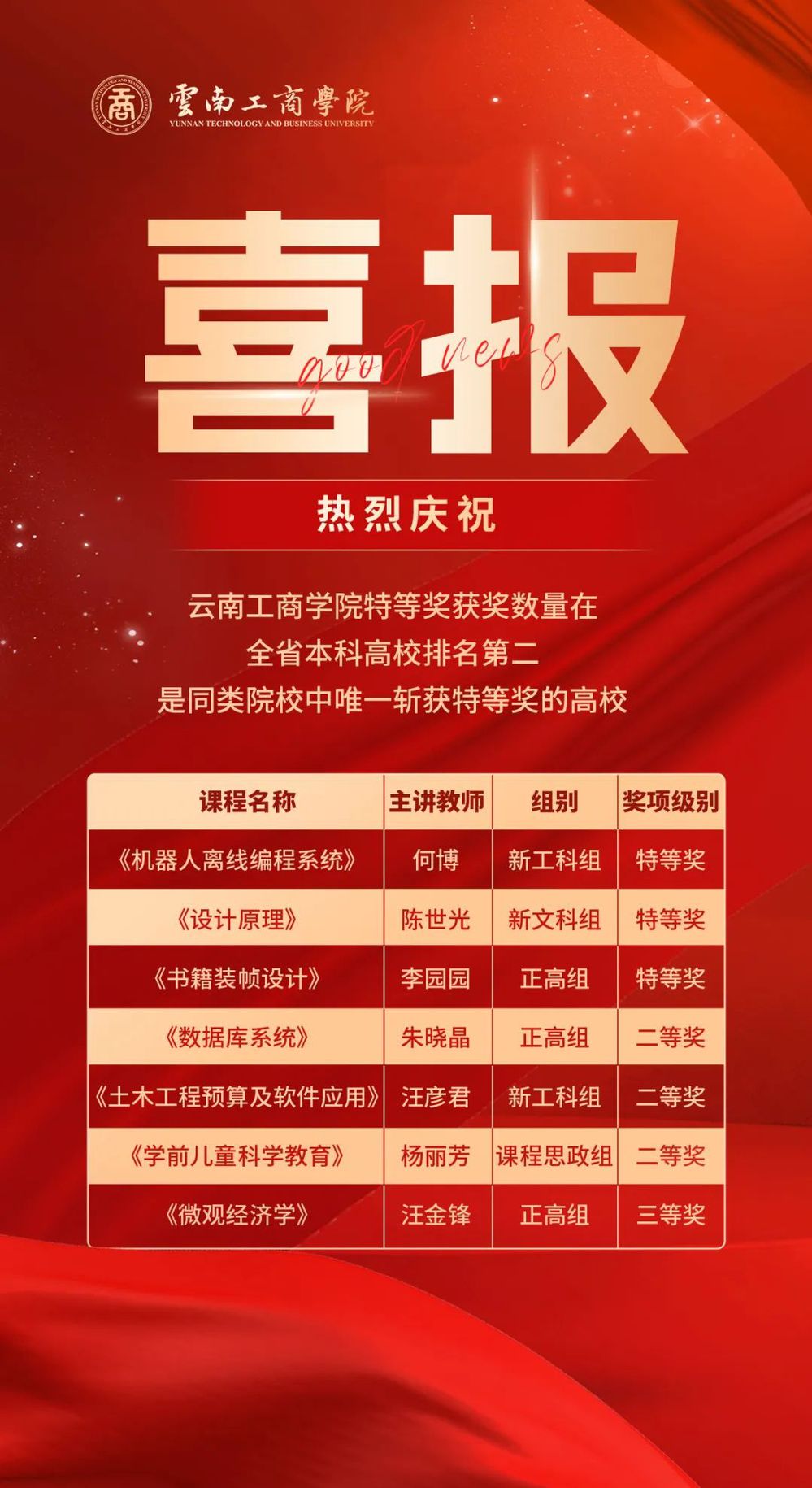 近日,taptap点点官方网站在第四届全国高校教师教学创新大赛云南赛区比赛暨第七届云南省高校教师教学大赛中荣获特等奖3项(晋级国赛),二等奖3项,三等奖1项,特等奖获奖数量在云南省本科高校排名第二,是同类院校中唯一斩获特等奖的高校。