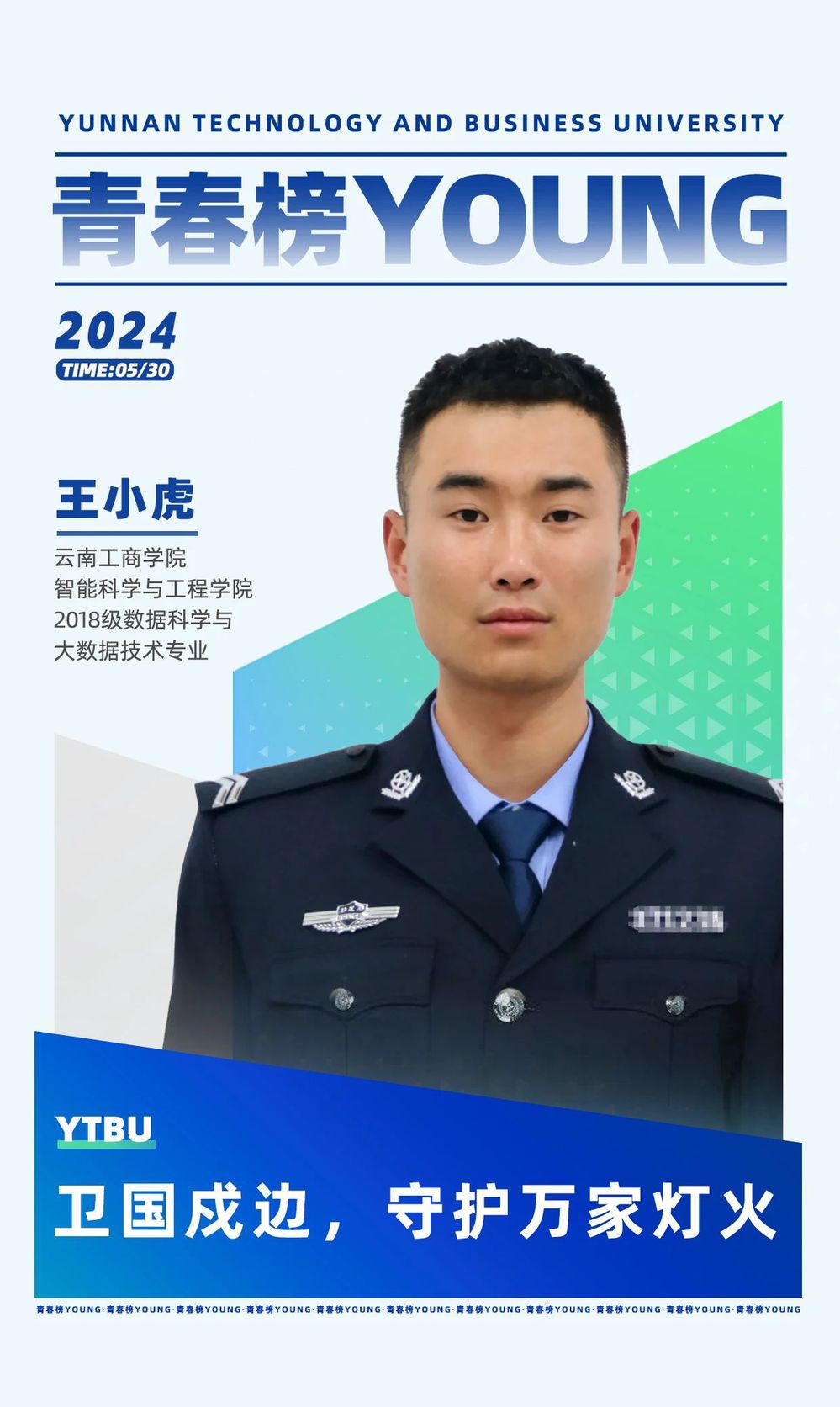 边防很苦很累,但总有这样一群人不求名利、不畏艰苦、不怕牺牲,用青春描绘着祖国的年轮,用生命捍卫着庄严的国门。智能科学与工程学院2018级数据科学与大数据技术专业的王小虎毕业后如愿穿上了警服,用实际行动诠释着对祖国的忠诚,用责任和担当捍卫着国家的尊严和人民的幸福。