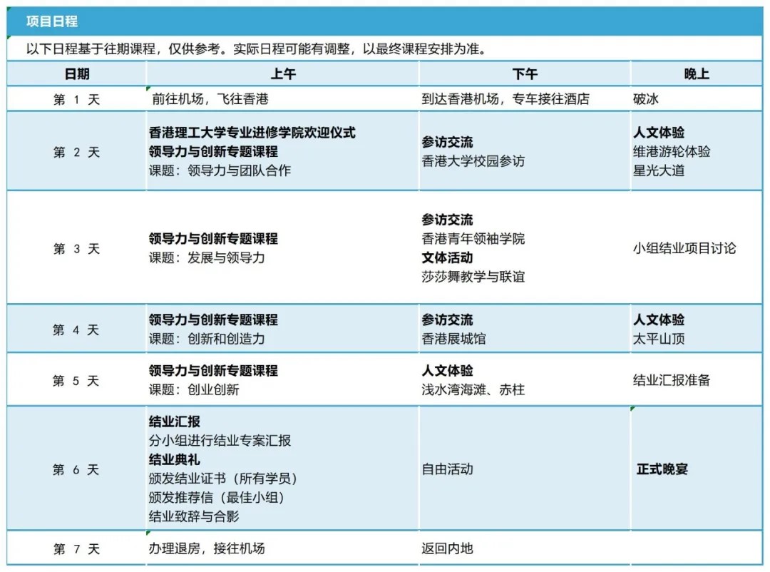 项目涵盖香港理工大学专业进修学院 (PolyU SPEED) 精选课程、结业比赛、名校交流、机构参访等内容,最大程度的让学员在短时间内体验香港的学术特色、品味香港的城市魅力。