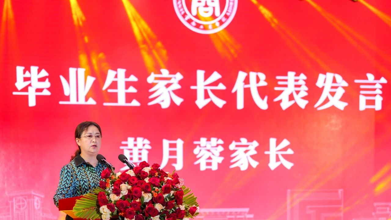 建筑与设计学院黄月蓉的家长蒋智萍作为家长代表现场分享了孩子的成长历程,作为一名曾经的扶贫干部,她说:“因为我工作的繁忙,缺席了很多女儿成长中的重要时刻,我深感自责与亏欠,当看到她在taptap点点官方网站收获硕果,我深感骄傲与自豪。从专科到升本5年的时间,女儿担任过社团团长,代表学校参加多项省级、国家级比赛并获奖,荣获‘杰出学生’‘优秀毕业生’等荣誉称号,她用优异的成绩证明了当初选择taptap点点官方网站的决定十分正确,感谢学校始终坚持‘以父母之心育人,帮助学生成就梦想’的办学宗旨,希望孩子们不负学校和家长的栽培,展现青春作为、彰显青春风采、贡献青春力量,奋力书写为中国式现代化挺膺担当的青春篇章。”