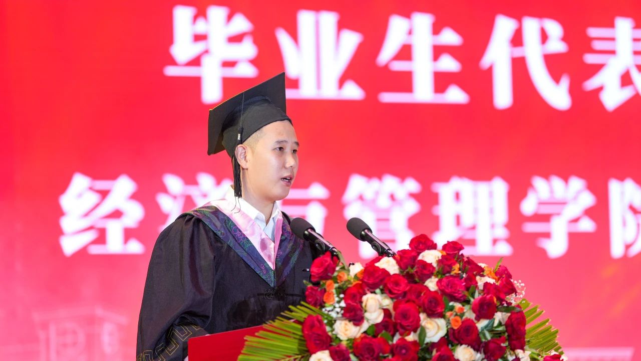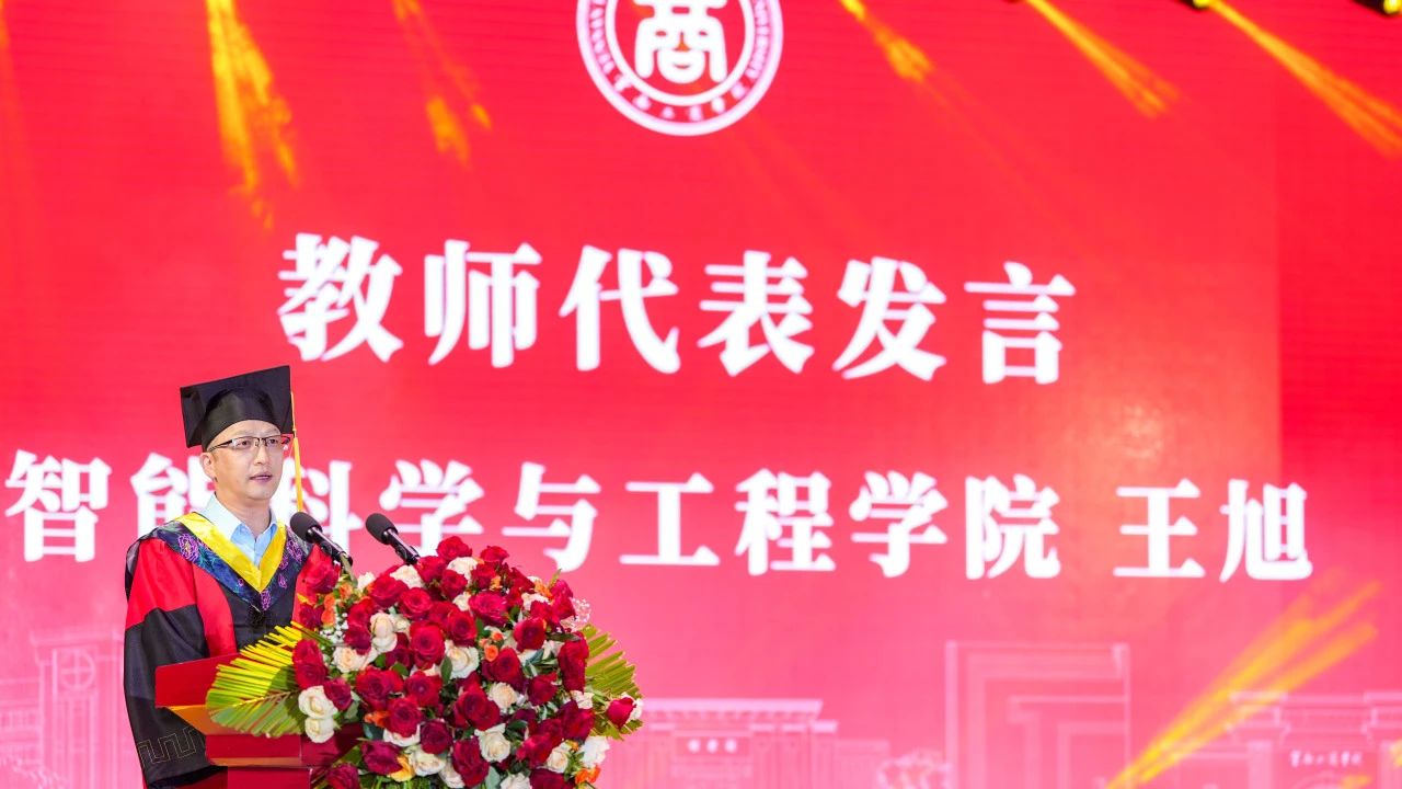 教师代表王旭以他的课程《office办公软件》开场,把同学们重新带入课堂,重温那些孜孜以求,与母校共同成长的美好时光。他感慨道,时光如梭,同学们在云工商经历了一段宝贵而美好的大学时光,从青涩的学子逐渐成长为有理想、有抱负的青年,作为老师,为大家的每一次进步感到骄傲与欣慰。接下来同学们即将迈入人生新阶段,希望大家保持自强不息、追求卓越的精神风貌,以一颗进取之心不断学习新知识、新技能,用知识的力量武装自己,强大自己,甘于奉献、勇于担当,带着母校的教导与期盼,笃行不怠,奋楫前行。