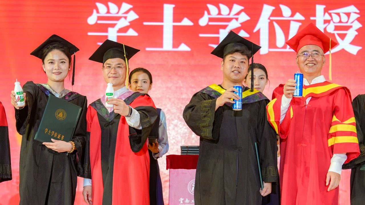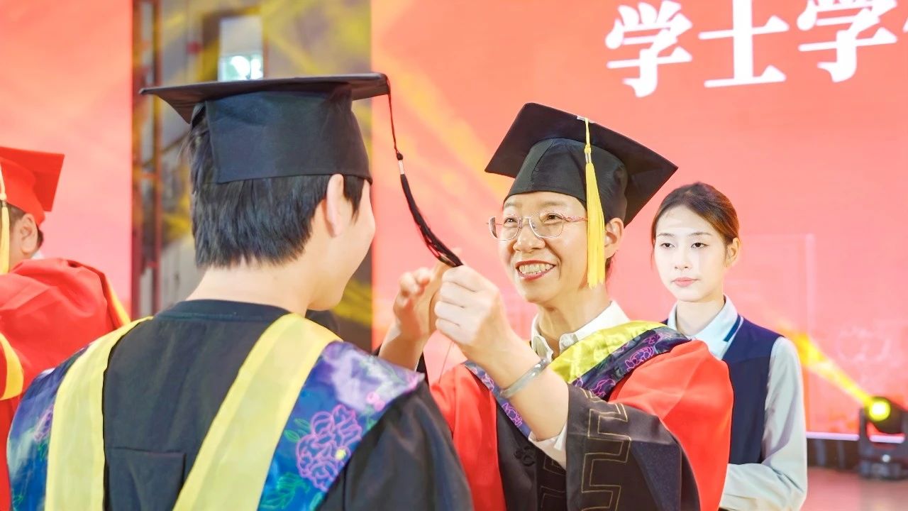 骊歌唱响,拨穗礼成。《关于授予2024届本科毕业生学士学位的决定》宣读完毕,学校导师团为各学院毕业生正冠拨穗,颁发学位证书,并与毕业生合影留念。