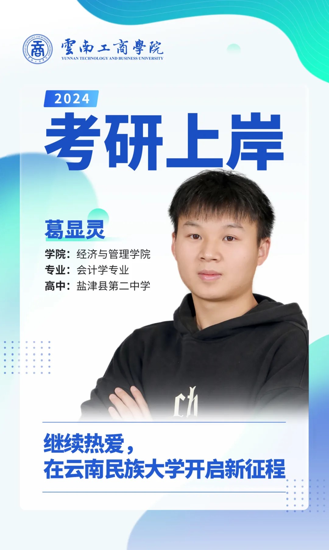 大家好,我是葛显灵。高中毕业于盐津县第二中学。今年考研上岸云南民族大学,研究方向为会计。