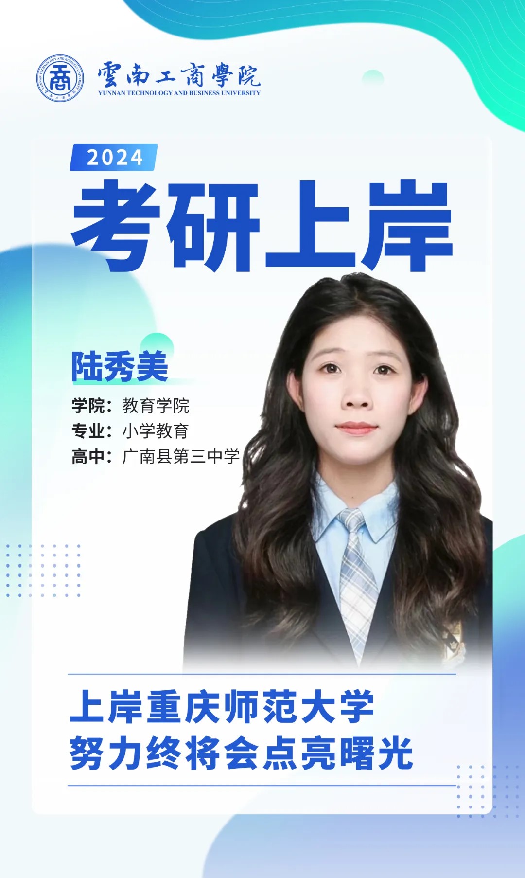 大家好,我是2020级【本科】小学教育1班的学生陆秀美,高中毕业于广南县第三中学。在校期间曾获得国家励志奖学金、三好学生等荣誉。