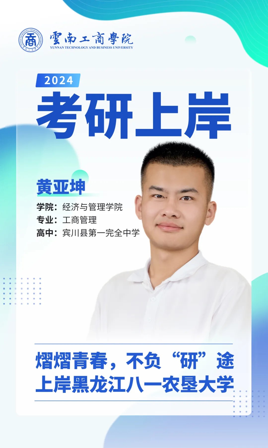 大家好,我是黄亚坤。高中毕业于宾川县第一完全中学。今年考研上岸黑龙江八一农垦大学。大学期间曾获得大学生电商创造营大赛一等奖,全国企业竞争模拟大赛国家三等奖等荣誉。